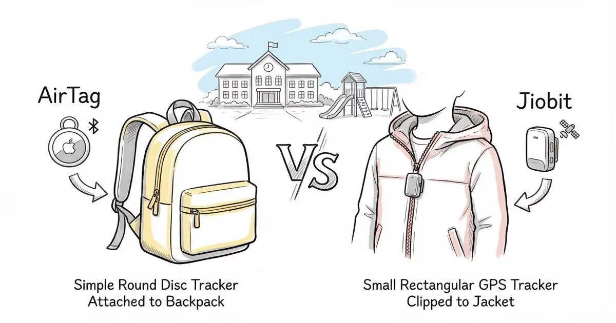 AirTag vs Jiobit is one of the most common comparisons parents search when choosing a kid tracker. Both devices are small enough to clip to a backpack or slip into a pocket, but they use fundamentally different technology. We tested both trackers over several weeks in school commute, after-school activity, and weekend outing scenarios to see how each performs when it matters most.